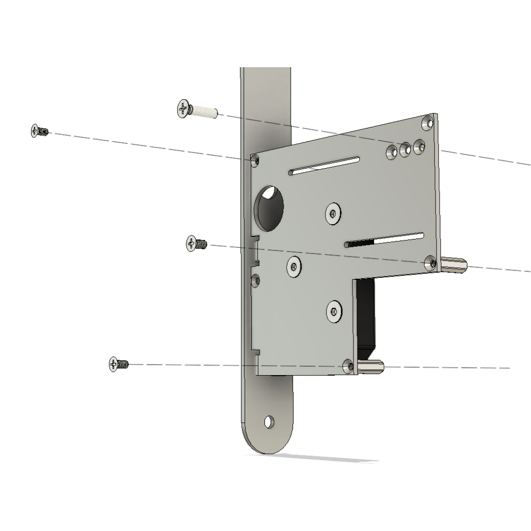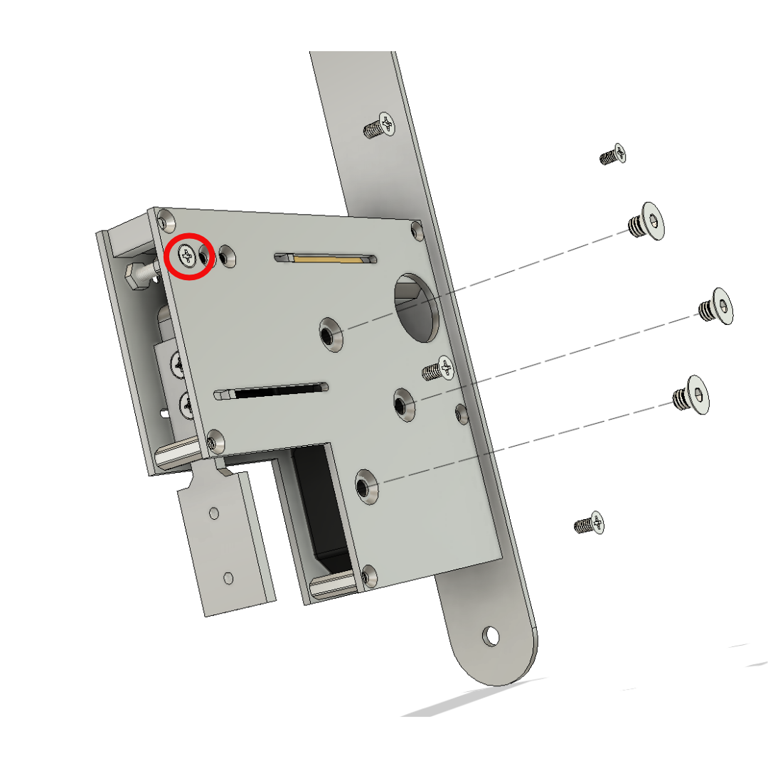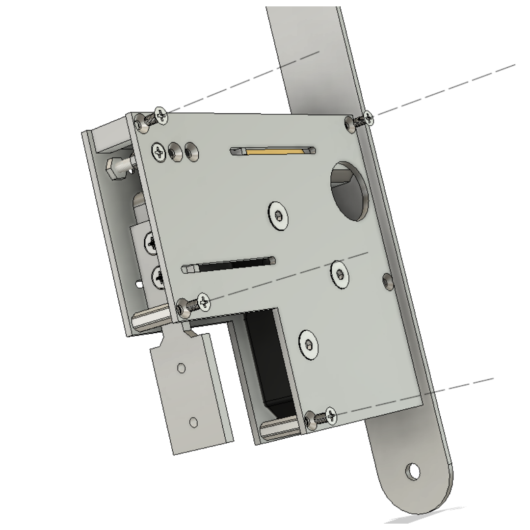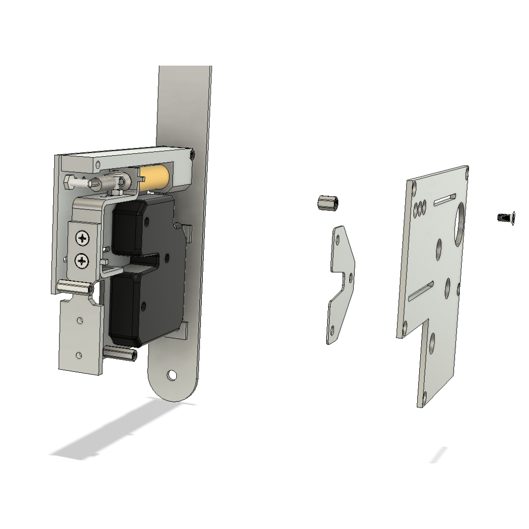 - Przykręć śrubami M4 elektrozamek do prawej blachy, upewnij się że podkładka 3D jest prawidłowo umiejscowiona.