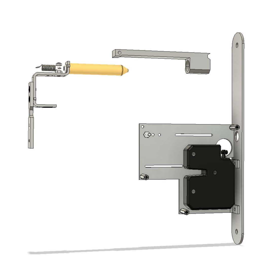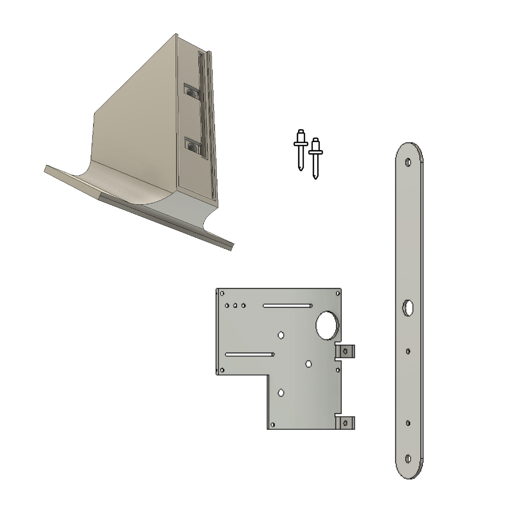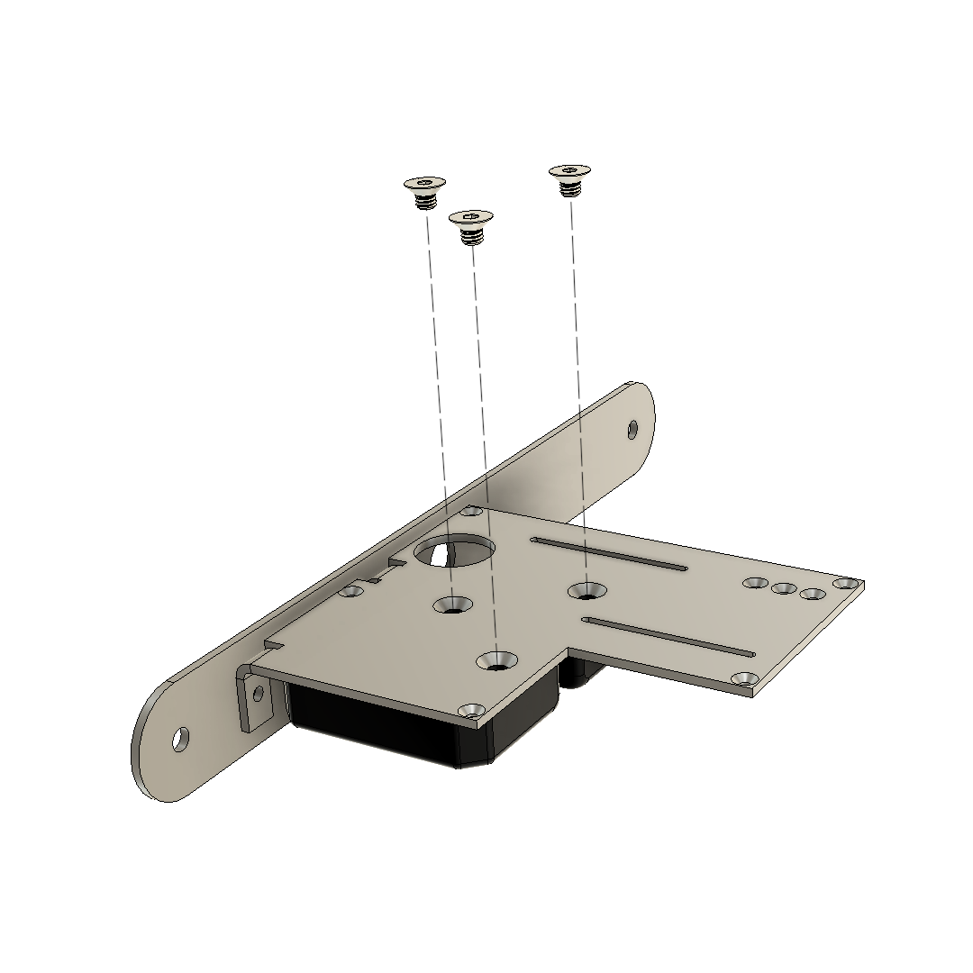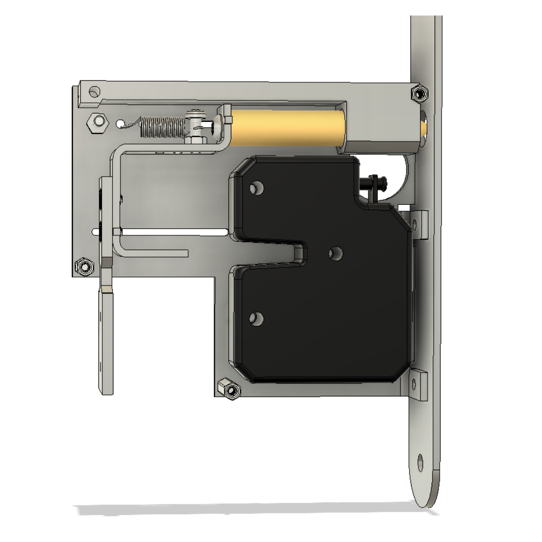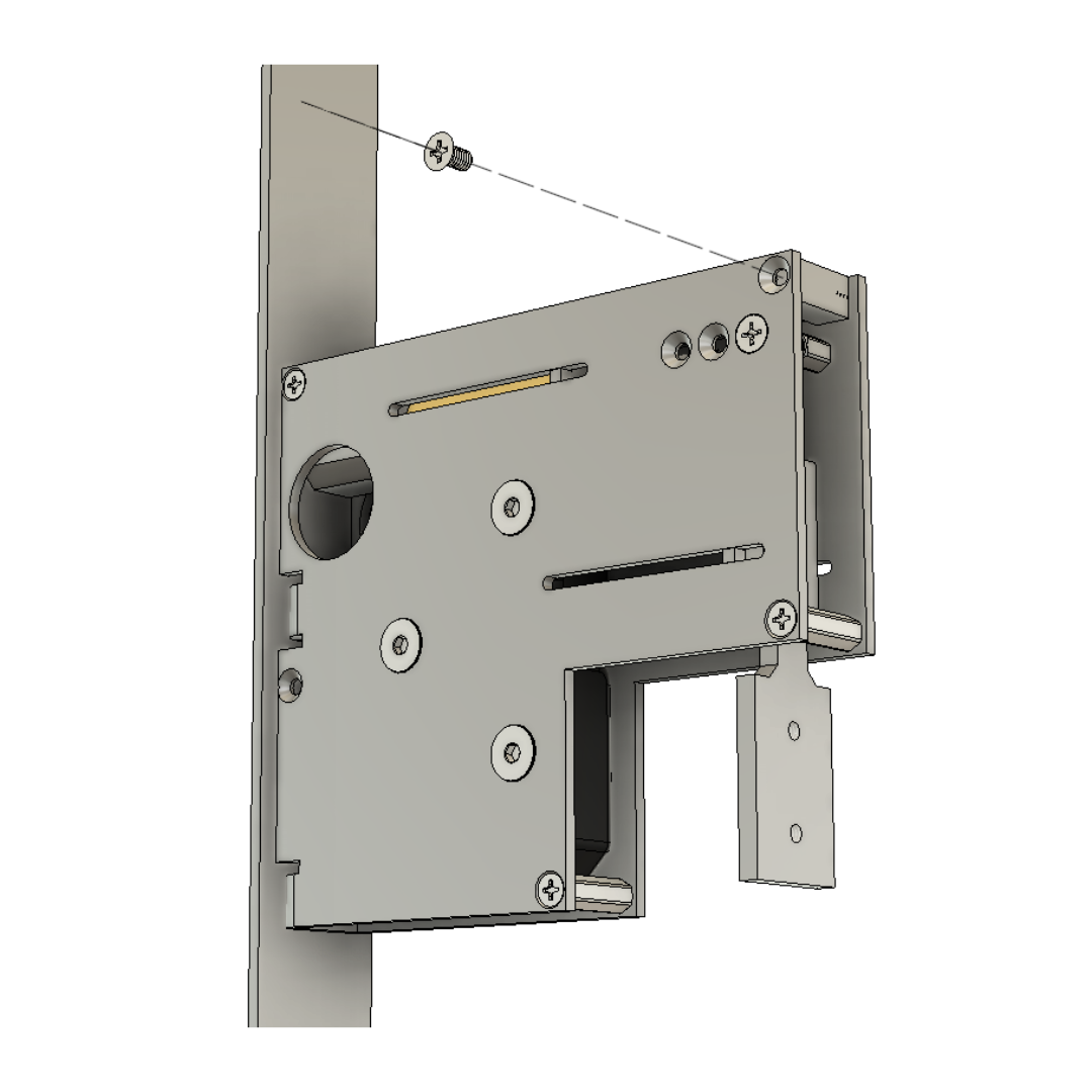 - Przykręć śrubami M4 elektrozamek do prawej blachy, upewnij się że podkładka 3D jest prawidłowo umiejscowiona.
