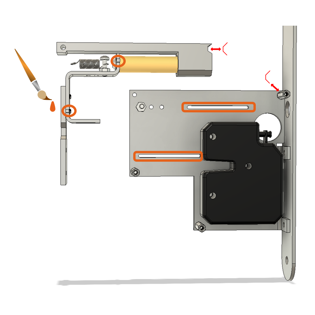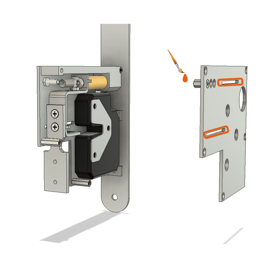 - Nanieś odrobinę smaru pędzelkiem na wypustki zespołu rygla (po obu stronach) oraz prowadnicę z w blasze.